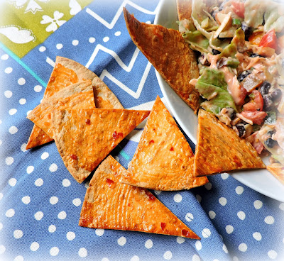 Serves 4Preheat the oven to 170*C/350*F/ gas mark 4. Butter a large rimmed baking sheet. Brush the chili sauce over the surface of the tortillas, almost to the edge. Cut into 12 wedges each and then place onto the baking sheet in a single layer. Cook for about 12 minutes in the preheated oven until golden brown.