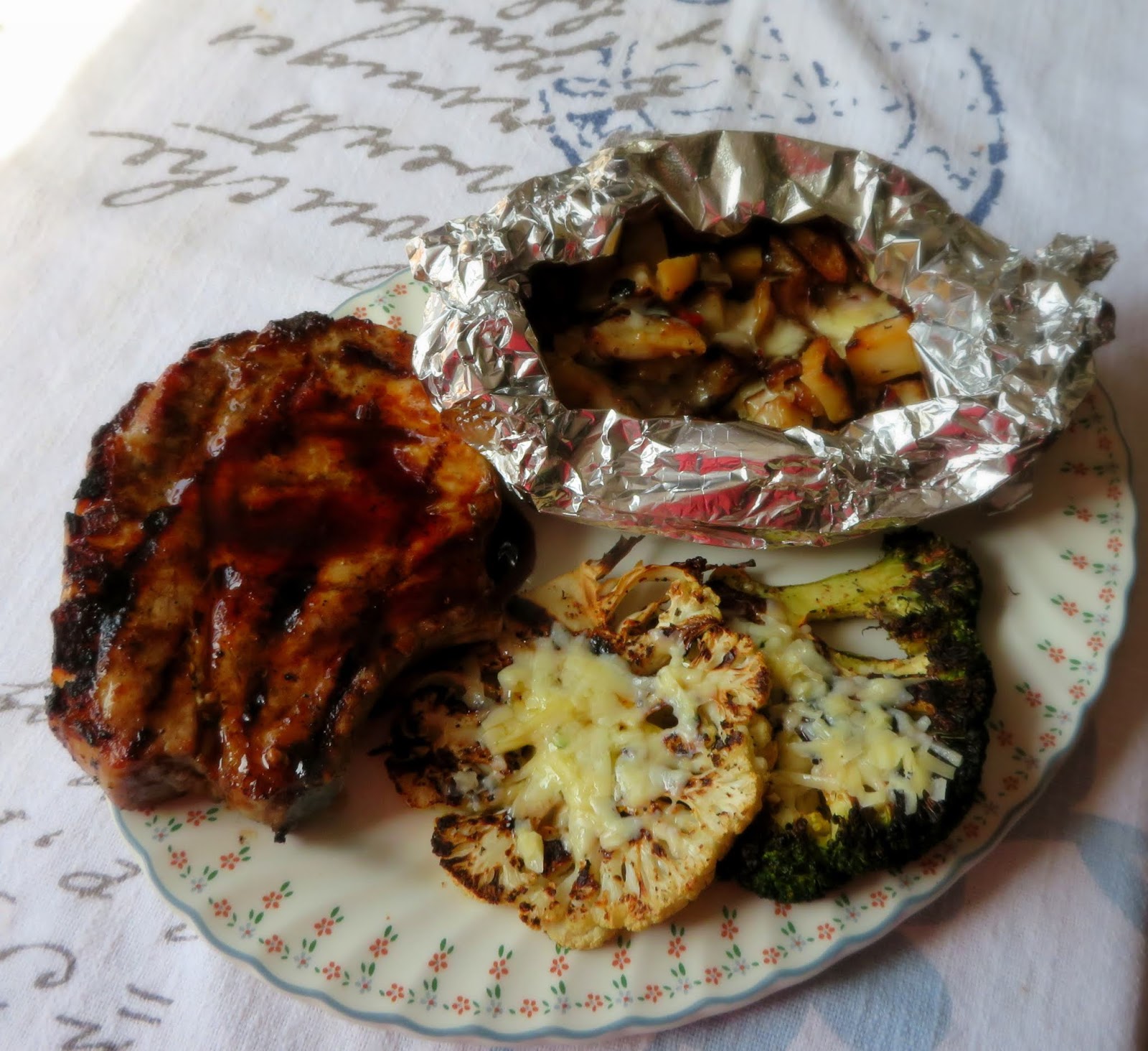 I had some leftover potatoes from the day before, which I divided between two foil packs. I just sprinkled them with some cheese and let it all melt into them while they heated on on the corner of the BBQ.
